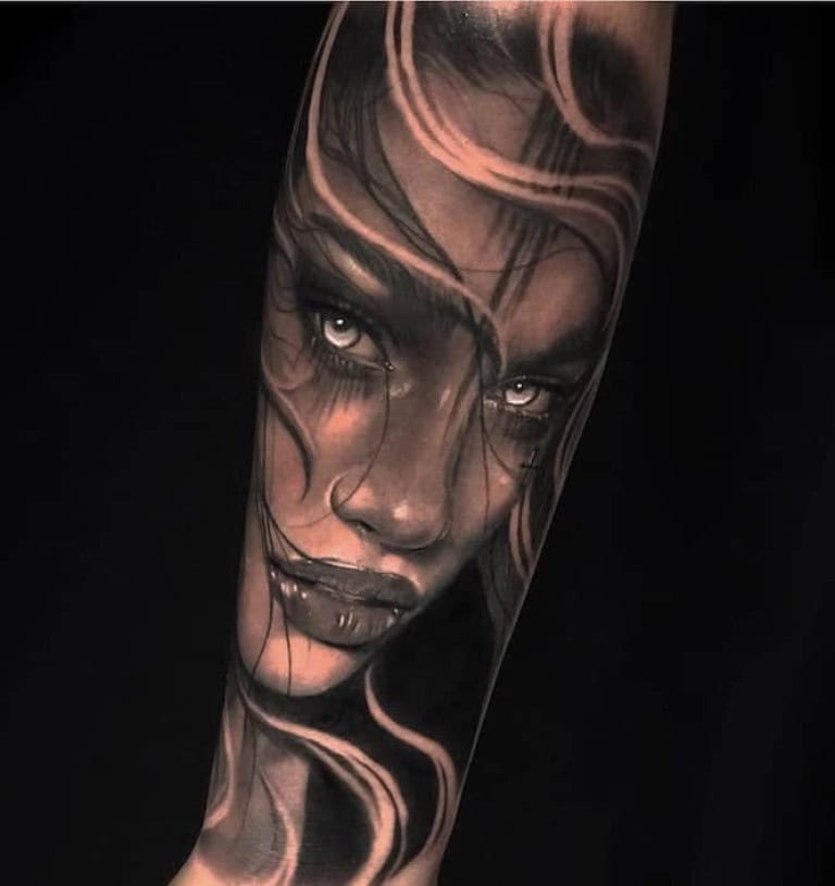 Chanelle Jasmin specialises in black and grey realism and has been tattooing for nearly 10 years. She is a world-renowned tattoo artist recognisable for her beautiful, realistic designs, mostly presenting women’s faces in dark fantasy compositions.