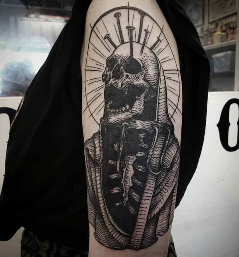 Mauro is an Etching Tattoo Artist based in London, specialising in blackwork, Engraving Tattoo style, and distinctive dark-themed designs.